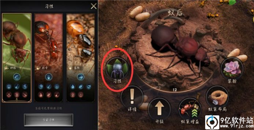 ⑨习性选择按照自身情况选择,喜欢掠夺的玩家即可选择掠夺;喜欢挂机的玩家可以从畜牧和种植之间选择;其中畜牧主要是提高没法经常性登录游戏的玩家选择,提高蜜露产量和降低进食区资源消耗;种植适合利用资源加工地定期产出各类资源以及兵蚁外出采集提高采集速度快速发展。