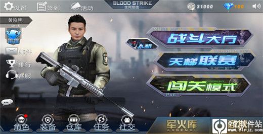 主界面最显眼的位置是玩家当前的游戏角色,占据画面的大部分,其次是位于角色右侧的战斗选择,包括战斗大厅、天梯联赛、闯关模式等选项。游戏系统被分布在 了画面的左侧与下方。左上角是签到与公告栏。左侧与左下角是玩家的个人信息,背包仓库与交互系统,在这里可以查看个人数据,整理装备,添加好友、收发邮件 等。右下角是军火库和商城的消费场所。总体来说,整个界面布局层次分明、井井有条,让玩家能够一目了然。