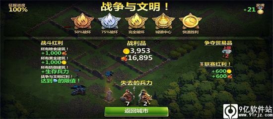 战争与文明国际服手游主打战斗和经营玩法,在战斗上操作简单,难度不大,比较注重策略,玩家要通过你的聪明才智想好合适的战术,布局好阵容,在这个地图上还有多种玩法模式,例如50V50这种超大规模的军团作战玩法,更加热血刺激,带给你宏大震撼的游戏体验。除此之外游戏在经营玩法上也比较真实,俗话说兵马未动,粮草先行,在硝烟弥漫的战场上,资源是战争的物质基础,要保证粮草和其他资源的充足才能保证战争的胜利,因此发展经济并不可少,在你的城池里要经营好各项生意,发展经济才能更加强大,喜欢该游戏的小伙伴们就快来9亿软件站下载征战各方文明吧。
