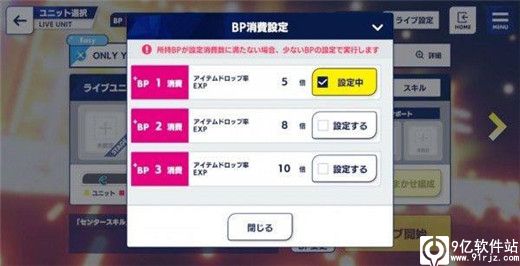 玩过es1的玩家都知道es1很容易升级,活动期间升级就可以回复全部的体力,不过es2前期虽然升级快,但是后期升级要求会越来越高,所以如果可以的话我们要尽量珍惜我们的体力,在打歌界面我们可以调整BP的单次消耗,BP消耗的越多单次奖励越多,但是BP的性价比会降低,所以可以的话,我们尽量不要选择太高的单次消耗,能多赚点是一点嘛。