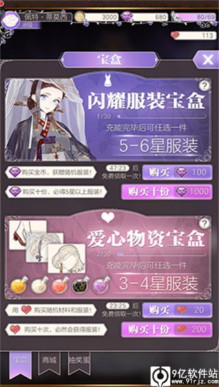 1、玩家在商场中可通过钻石购买一些搭配及首饰,闪耀服装宝盒及爱心物资宝盒都可进行免费购买,等待冷却时间即可。两种宝盒各自在购买三十次后都可获得一件任选3-6星服装。同时在舞会中,打扮符合人们的喜好所获得的爱心也可用于在爱心物资宝盒中进行抽奖。