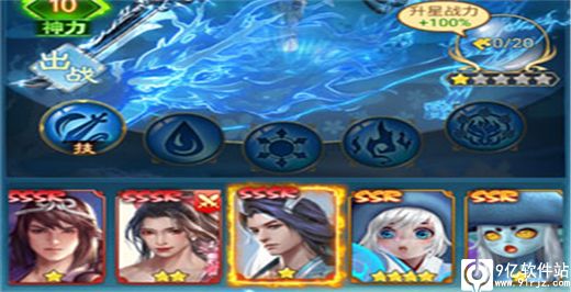 在游戏中,获得的神将分为四大属性,炎、冰、毒、雷,每个属性的神将只能上阵一个,点击“一键上阵”可自动上阵最高品质的神将,突破神将和激活技能、羁绊等可快速提升神将战力。