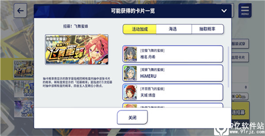 >>活动招募:每期会有全新的一张☆5,一张☆4,两张☆3卡片限时up,此招募能提高对应卡片的获取概率(☆5和☆4为同星级卡片1/3左右出现概率,☆3为同星级的1/5左右),将该招募中的up卡片,编入组队中可以提高同期开放的限时活动的pt获取。