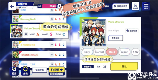 >>难度调整:每首歌曲拥有Easy、Normal、Hard、Expert四种难度及MV模式。越往后难度越高。