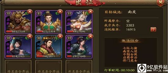 16、找好武将后,就必须要照每个武将的性质排,象是御高的或兵力多的武将就站在前排,而勇高或智高的武将就站在后排……等(这些是我喜欢排的阵型,你不一定要用我的),都排好后,就可以出征了。