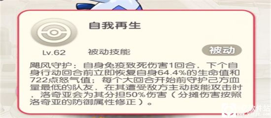 被动技能免死还是很赞的,复活血量64%,但是有个非常难受的地方,他会保护队伍血量最低的精灵,我试了几次打副本感觉这个技能特别作死。他本身防御还挺高的,保护完队友一个技能两个残血。