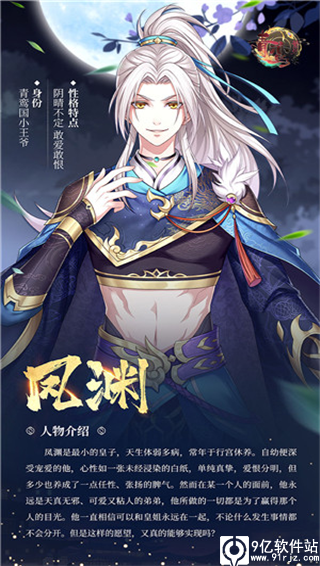 在游戏中凤渊是最小的皇子,天生体弱多病,常年于行宫休养。自幼便深受宠爱的他,心性如一张未经浸染的白纸,单纯真挚,爱恨分明,但多少也养成了一点任性、张扬的脾气。然而在某一个人的面前,他永远是天真无邪、可爱又粘人的弟弟,他所做的一切都是为了赢得那个人的目光。他一直相信可以和皇姐永远在一起,不论什么发生事情都不会分开。但是这样的愿望,又真的能够实现吗?