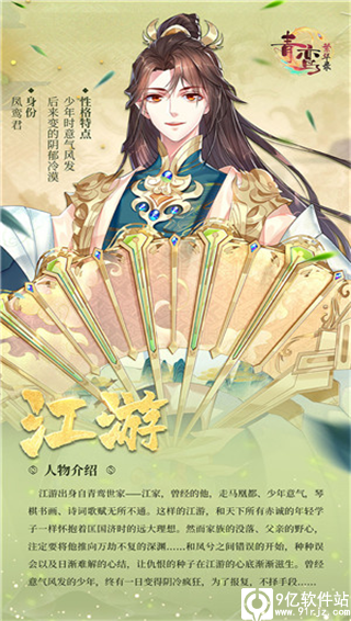 出身青鸾世家江家,曾经的他,走马凰都,少年意气,琴棋书画、诗词歌赋无所不通。这样的江游,和天下所有赤诚的年轻学子一样,怀抱着匡国济时的远大理想。然而家族的没落、父亲的野心,注定要将他推向万劫不复的深渊……和凤兮之间错误的开始,种种误会而日渐难解的心结,让仇恨的种子在江游心底渐渐滋生。曾经意气风发的少年,终有一日,变得阴冷疯狂,为了报复,不择手段……