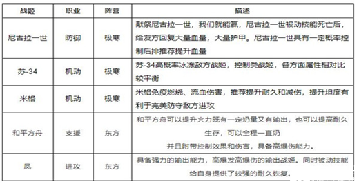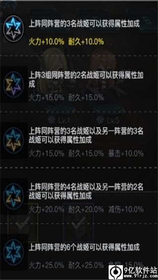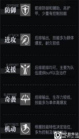 战姬共有5种职业,分别为防御、机动、进攻、奇袭、支援