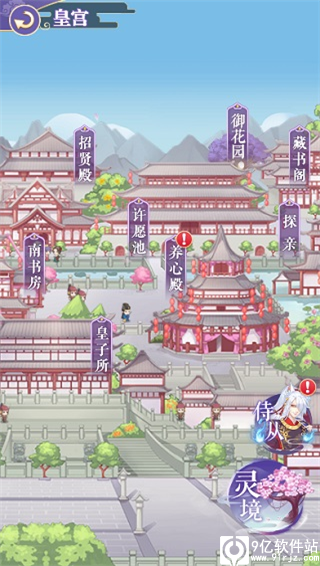 6.皇宫(1级开启):包括御花园、招贤殿、藏书阁、许愿池、探亲、养心殿、皇子所。