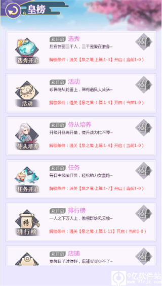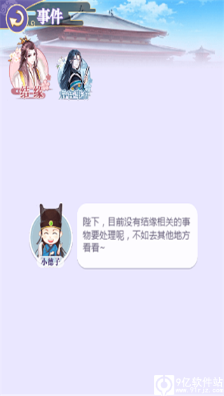 11.事件(通关灵境关卡2-9开启):事件中包含了皇子出仕结缘相关事件和后宫事件等等,及时通知陛下宫中大大小小事宜,成为陛下管理后宫的好助手。