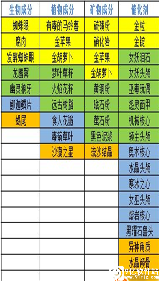 炼金原料分为4个大类:生物材料、矿物材料、植物材料、催化剂