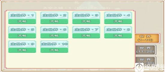 奶块4399版的世界分为30个各自独立的世界,但玩家可以免费传来传去。在天空之城,点击传送水晶,会出现世界地图,如下图所示(由于地图资源大,加载会略慢,请耐心等待一下)