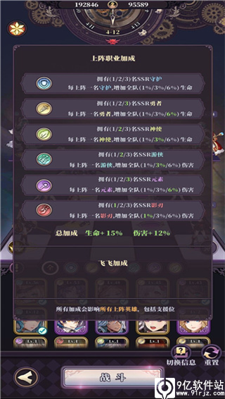 点击战斗页面右上方图标,可以看到根据上阵的职业和数量来决定最终的队伍加成,并在下方显示出来。