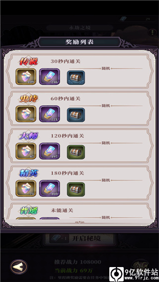 当然你的阵容越厉害,通过时间越短奖励越丰富,这边会有等级设定,主要分为:普通-精英-大师-史诗-传说。具体奖励如下: