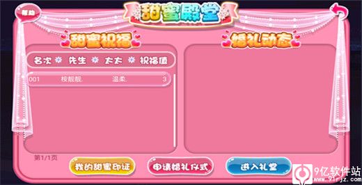 情侣间的亲密度达到100以后,只需使用“仪式申请函”道具,即可在甜蜜殿堂房间中举办属于自己的盛大婚礼。婚礼房间为全新3D房间,玩家可以在房间中自由走动。新人可以邀请8名好友参与自己的婚礼,并且可以指定其中1人为自己婚礼的证婚人。