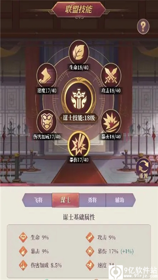 飞将、勇将、谋士、辅助四个职业对应各自的联盟技能,每一类只对相应的职业加成。消耗铜钱和青龙玉可以提高对应职业的基础属性。