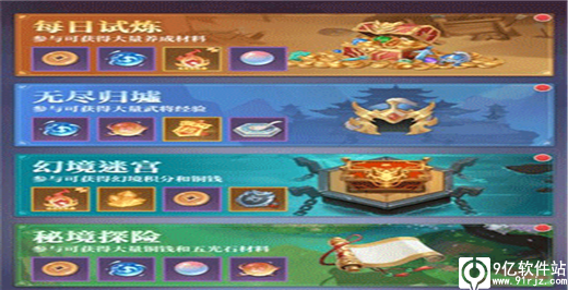 主界面【冒险】处有四大副本,每日必打,除了基本资源外,还能获得一些稀缺的奖励,下面就由小编带大家了解了解。