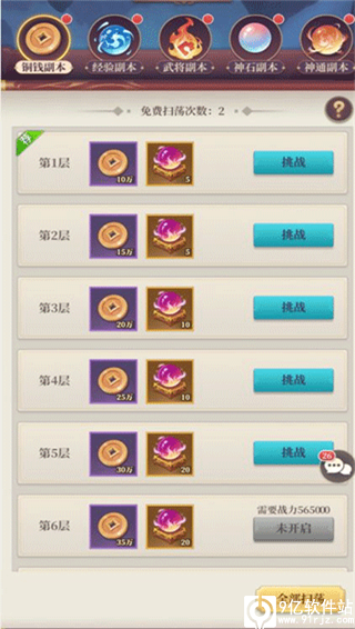 内含铜钱副本、经验副本、武将副本、神石副本和神通副本。