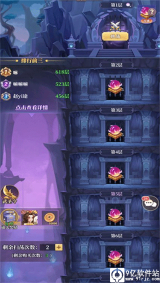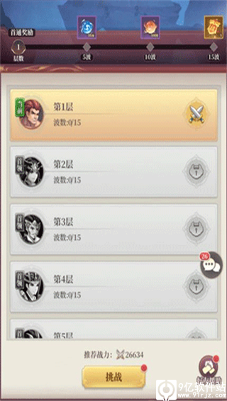 爬塔玩法,首通可得武灵丹,扫荡能得铜钱和武将经验。每10层能获得一份通关奖励,如武将碎片、高级诏令、橙装、红装等。