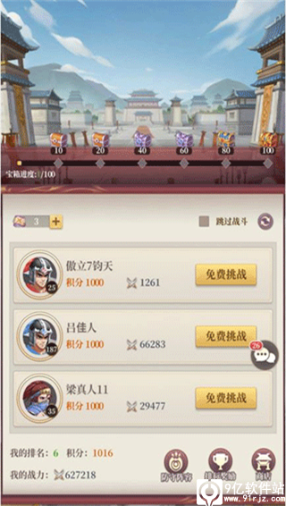 每次挑战可得一份随机奖励,如铜钱、武将经验、演武币、武灵丹等。