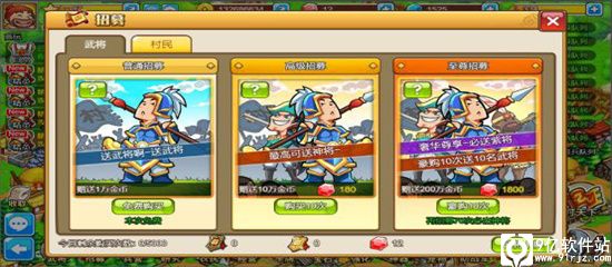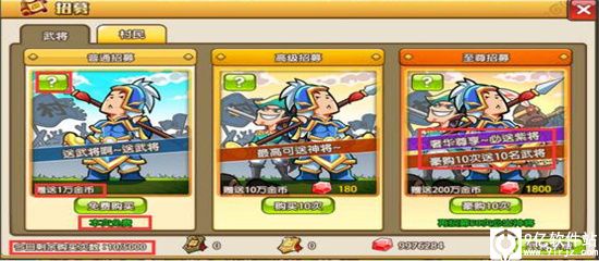 1、村长大人们可以在村庄界面下部点击【招募】→【武将】进入武将招募界面。每次招募都会额外赠送金币。