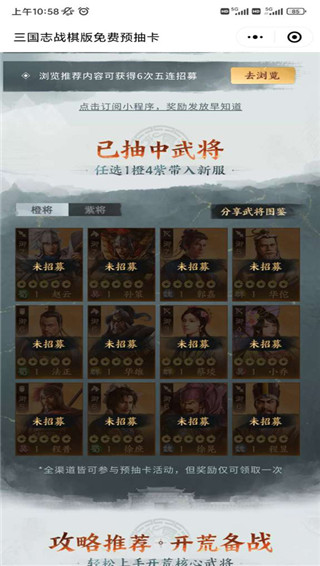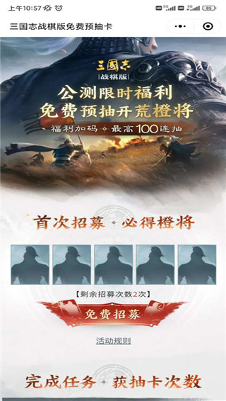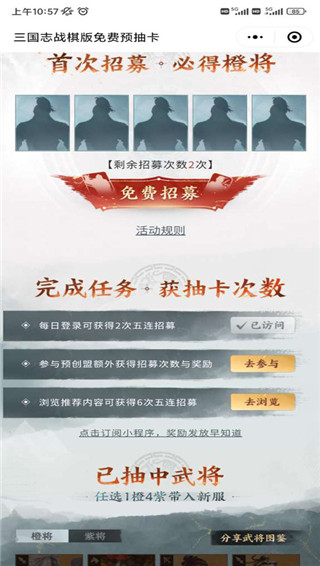 活动入口:通过微信小程序或者公众号可以参与,每日在线抽卡获得橙卡和紫卡,可以在活动期间兑换,在游戏开测后即可获得对应武将。