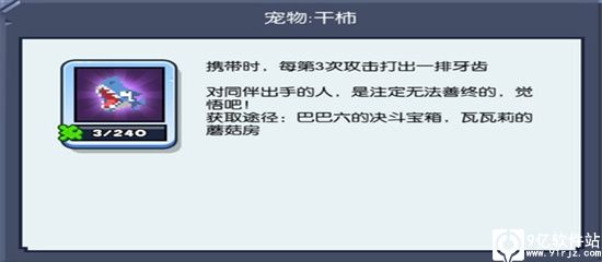 干柿可能是无尽之海中的一只可怜的小鲨鱼,从其眼角滑落的泪水足见其悲惨的幕后故事,就是不知道它与瓦瓦莉手中挥舞着的武器鲨鱼有什么关联。作为攻击型宠物,携带时,每第三次攻击都将打出一排牙齿。这里有一个小彩蛋就是,这排牙齿的攻击对象是谁这里没有明确说明,而从其说明中看是否可以对队友使用?对同伴出手的人,是注定无法善终的,觉悟吧。