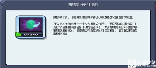 这是瓦瓦莉在不小心掉进一个古墓之中后,无意中发现的,是一个盗墓者留下的宝贝,从其散发的看,好像具有延年益寿的效果,虽然不知真假,但是携带后,的确能在拾取道具的同时恢复少量生命值,这无疑大大加强了在蘑菇岛中生存的几率。