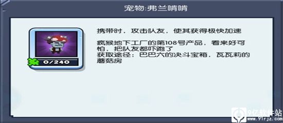 听说有队友坑你?那么当你看到这只弗兰啃啃的时候,你一定会大呼,坑队友的新时代要来临了。这是疯猴地下工厂的第108号产品,看起来十分可怕,总是会将队友全都吓跑。携带者能够通过攻击队友,使队友获得极快的移动速度加成。这意味着,当你被队友推向敌人斧下时,你很难通过操作跑掉了。