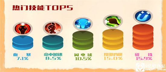 在辅助提升之后主力参战队员则依靠磁铁进行快速发育,所以技能磁铁与投掷鸡腿分别以高达15.9%和15%的选择率高踞榜首,而具有保护性的闪电球则只有10.5%的选择率。由此可见对于选手来说,通过辅助技能角色之间相互配合以及快速发育技能才是制胜的王道!