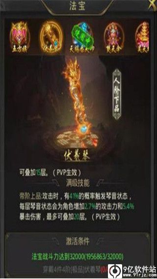 5阶法宝(龙城二层开启后可兑换,开区120天混沌龙城可爆),单体攻击类法宝,在四次命中敌方后皆可触发,随后的四次攻击将会得到高额攻击加成、高额吸血效果及单体控制效果,推荐主符咒。