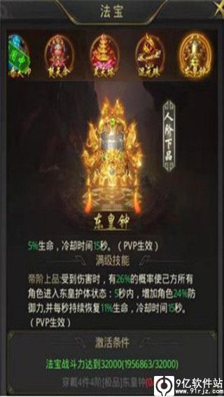 4、5阶法宝,单体防御类法宝,受到致命伤害(血量受到大比例伤害)时触发,免疫本次伤害并且立即回复部分血量,随后几秒减伤。对于刚进入一刀传世折扣版手游的玩家们来说,属于是前期非常实用的法宝,随着后期反伤、转伤,触发的概率变得很小。推荐主爆战、支援。