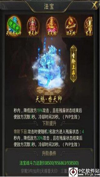 5阶法宝(龙城二层开启后可兑换,开区120天混沌龙城可爆),辅助类法宝,攻击时随机使敌方两名角色短暂时间降低攻击,随后短暂沉默。非常实用,推荐雷法、冰法。只能佩戴一套。