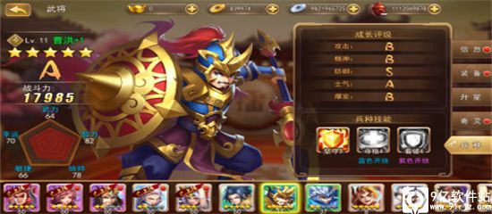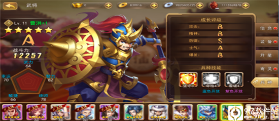 不同兵种的各个属性成长评级不同,直接影响其在战场中的作用,例如:突击骑兵移动时可以无视大部分恶劣地形,保持移动力;枪兵有着比步兵更远的攻击距离等等。兵种的特点还有很多,等着各位主公发掘发挥。