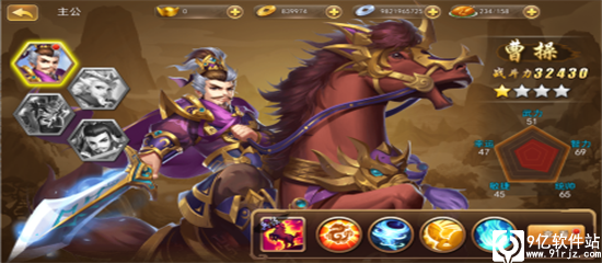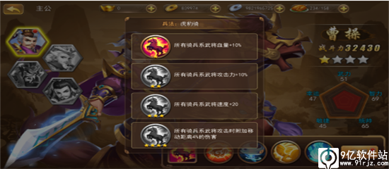 主公在战场中能够释放策略,英雄战斗;同时主公还有不同的兵法,可以给特定兵种增加属性,比如曹操的虎豹骑,就可以给骑兵系兵种增加各种属性。