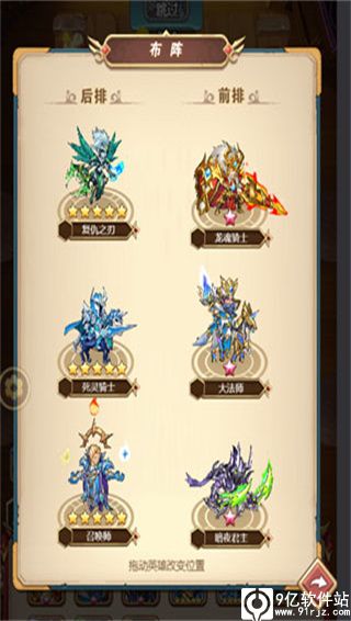 布阵界面可通过右下角按钮可以进行关闭。玩家可以在手里的英雄牌中勾选心目中的六个英雄上阵后再通过左上角布阵按钮,安排站位,迎接最终决战!(点击英雄可勾选,再点击可取消勾选)