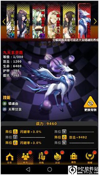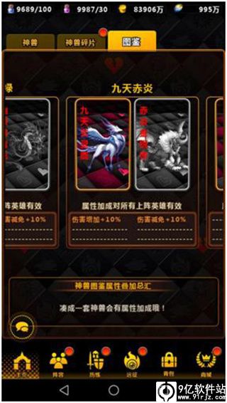 主界面培养——神兽——图鉴,可以看到神兽配对可以激活团队属性,用神兽币买蓝色,钻石买紫色,把橙色以下神兽都买齐,加的团队属性非常多。神兽升上5级左右,配给英雄,也能加一些四围。