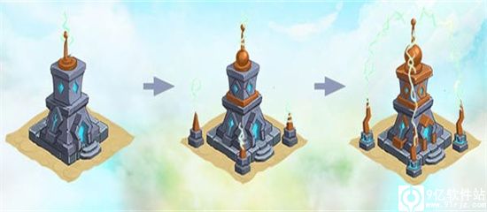 巨大的电流以弧形穿梭在高耸的尖塔之上,狂暴的电流被约束在元素塔中,通过吸取其中的雷电元素可以帮助电属性龙提升力量。