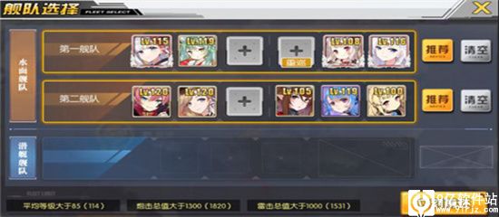 2、队伍搭配:第一1队道中,第2队BOSS,1队刷全图时候旗舰注意血量,血太低时候可以将补给放旗舰位,等级要求,100即可。