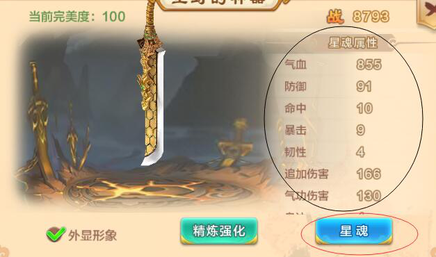 1.星魂位置:红色圈为星魂升级升阶的地方,黑色圈为当前星魂的属性。