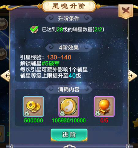 图中7颗星我们可以称为辅星,辅星到达一定等级就可以升阶主星!每次升阶主星对辅星的要求是不一样的,经过我的测试,一阶升二阶需要一颗辅星达到要求,二阶升三阶也是一颗,三升四需要两颗,由于金钱有限,我就只能测试到这个位置了,剩下的就交给玩家们了!