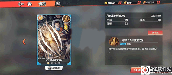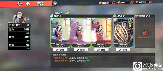 除了等级以外,角色还可以通过装备卡片来提升自己的实力。卡片分为战意卡/激斗卡/究极奥义卡三种。