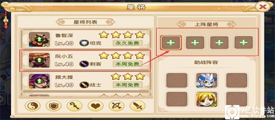 右上红框是上阵星将操作界面,操作流程是先点任一“+”的图标,这时带“+”的框框会变成红色框框,然后点左边想要上阵的星将就可以了。