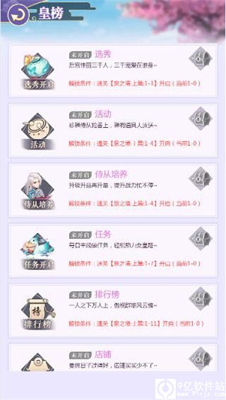 6、皇宫(1级开启):包括御花园、招贤殿、藏书阁、许愿池、探亲、养心殿、皇子所。