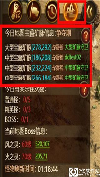 进入外城后,点击【任务栏】--【外城按钮】,领主们就可以查看到当前所在地图的宝藏矿脉坐标、占领者的信息、矿脉目前的状态。
