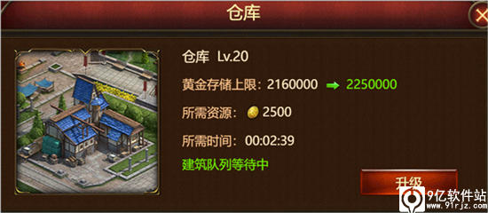 4、在仓库中,升级等级可以提高黄金储量上限。游戏中随着等级的提高,黄金的产量也会越来越多。尽早提升仓库等级可以避免资源的浪费。