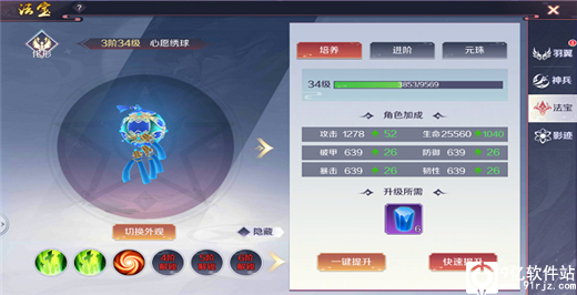 4、可通过收集各属性灵珠来提升法宝的元珠属性,元珠升阶后可百分比提升法宝属性加成。
