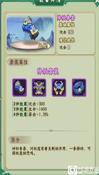 游戏内的紫色装备主要分为降妖套装和如意套装,分别对应游戏内的输出类角色和坦克类角色的装备,输出类角色推荐使用降妖套装,坦克类角色推荐使用如意套装,如意宝刀作为所有坦克类葫芦娃的缘分武器(小金刚除外),多使用并且强化可以更好地强化自身属性以及战力,降妖套装主要提升的则是输出,推荐给后排葫芦娃使用。