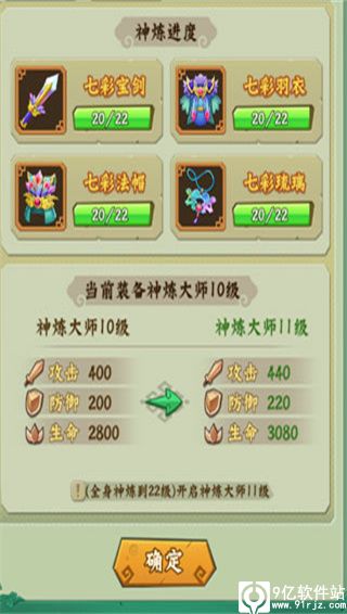 装备还可以通过消耗神炼石来进行神炼提升属性,神炼石分为初级,中级,高级,终极4种类型,金色装备神炼等级达到18级以后每5级会额外增加一次属性(详见上图七彩防具,由于神炼额外等级效果金色防具都是相同的,这里不多作解释),不同部位增加的属性不同,和装备大师一样,游戏也设置有神炼大师的效果,每10级提升1级神炼大师等级,神炼大师可以额外增加攻击,防御和生命三种属性。